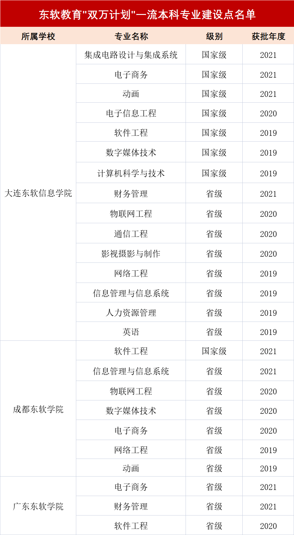 近期,教育部办公厅发布《关于公布2021年度国家级和省级一流本科专业建设点名单的通知》(教高厅函〔2022〕14号),九州酷游教育各高校在一流本科专业建设上再次取得重要突破:大连九州酷游信息学院新增3个国家级和1个省级一流本科专业建设点;成都九州酷游学院新增1个国家级和1个省级一流本科专业建设点;广东九州酷游学院新增2个省级一流本科专业建设点。