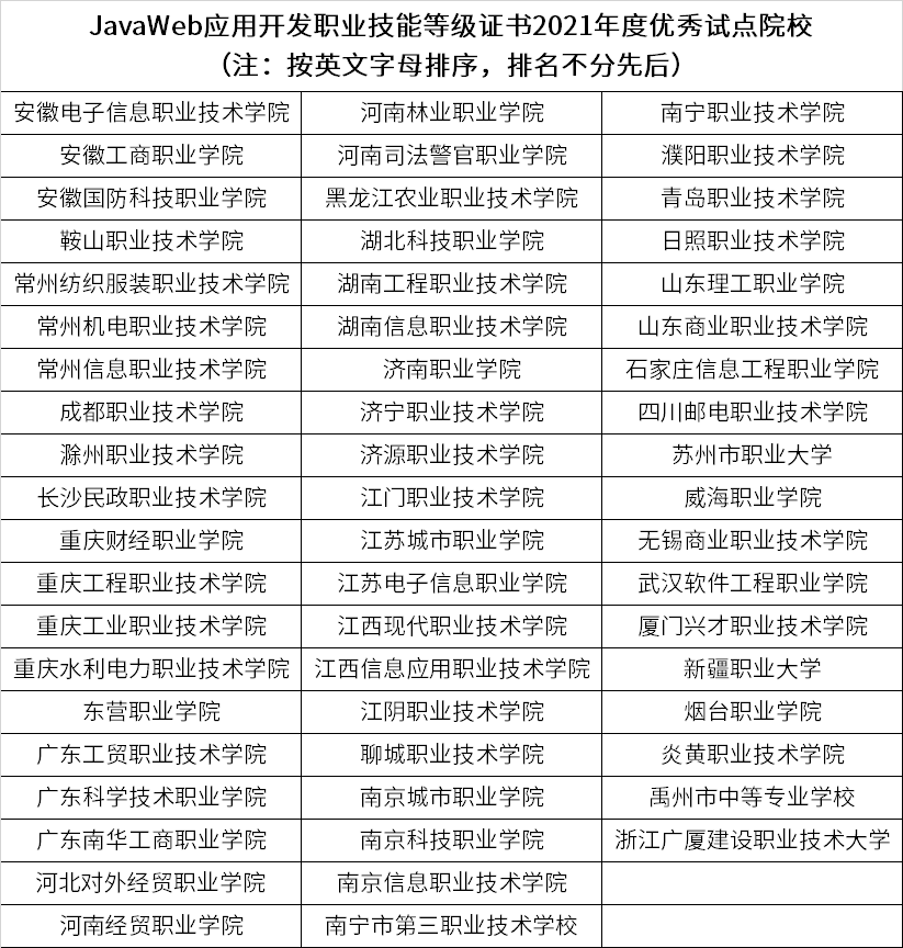 关于公布2021年度JavaWeb应用开发职业技能等级证书试点工作优秀试点院校及优秀考评员获奖名单的通知