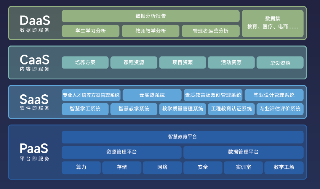 具体而言,“4S”教育服务体系,包括云服务(PaaS——平台即服务)、教育业务软件服务(SaaS——软件即服务)、教学资源服务(CaaS——内容即服务)、数据分析服务(DaaS——数据即服务)四类。顺利获得这套完整的智慧教育软件生态体系,院校教学资源、教学管理、数据咨询等多种需求都可以得到满足。